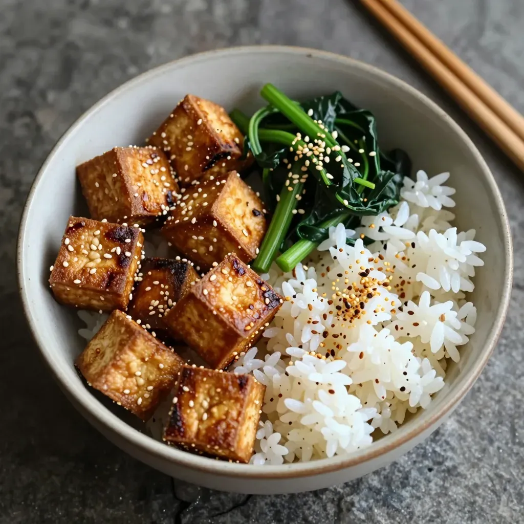 A close-up of a bowl featuring crispy tofu, fluffy rice, and vibrant spinach, with soft, diffused lighting highlighting the textures and colors. The shallow depth of field and textured stone background emphasize the food's freshness and appeal.