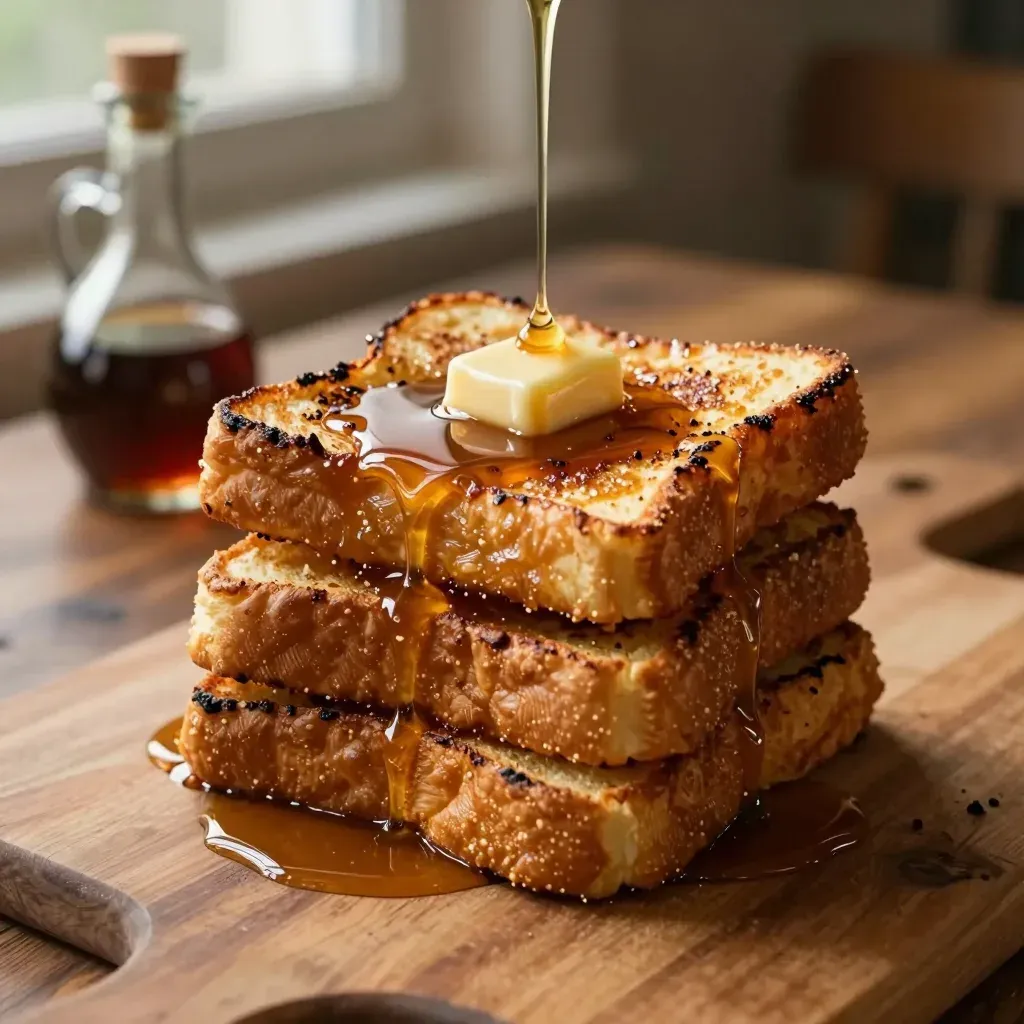 Golden-brown French toast slices are stacked with a pat of creamy butter and drizzled with glossy amber syrup, creating a mouthwatering presentation. The warm, natural light highlights the textures and colors, while a shallow depth of field keeps the focus on the toast, making it perfect for a cozy breakfast setting.