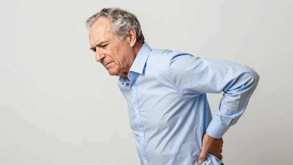 An elderly man leans forward with his hand on his lower back, wearing a light blue button-down shirt. The even, diffused lighting and neutral gray background emphasize the subject's posture and expression, creating a clear and focused image.