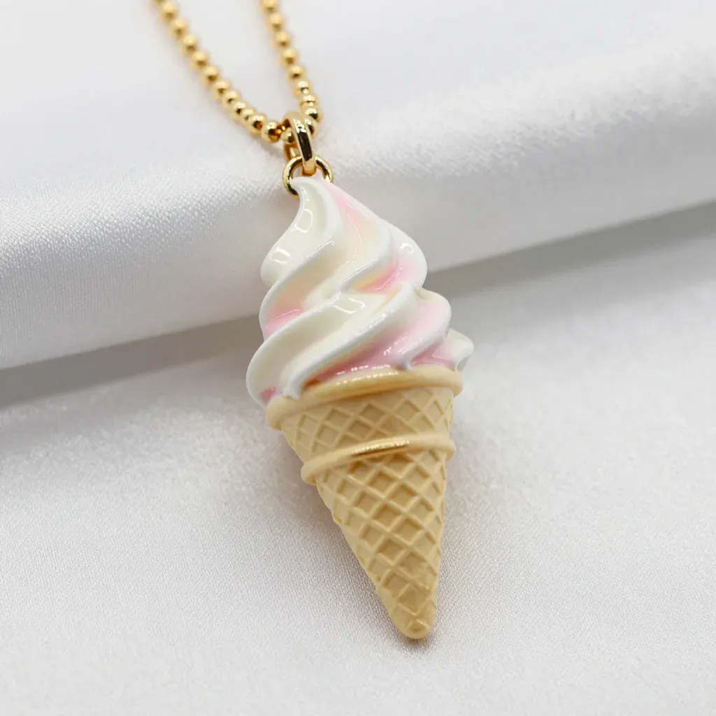 A close-up of a creamy ice cream cone pendant, showcasing its glossy texture and soft pink swirls, set against a clean white fabric background. The shallow depth of field and soft lighting emphasize the pendant's details and create a luxurious feel.