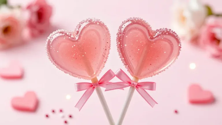 Two translucent pink heart-shaped lollipops with embedded glitter and glossy surfaces are tied together with a soft pink satin ribbon, set against a blurred floral backdrop. The soft front-lit composition with shallow depth of field emphasizes the subject while creating a romantic, celebratory atmosphere with bokeh highlights.
