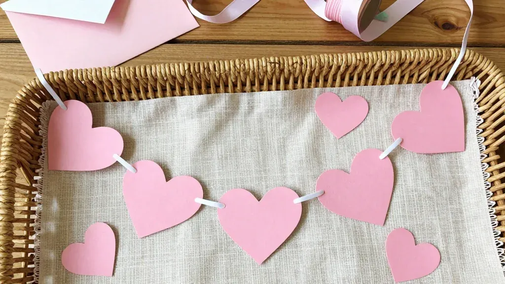 A delicate paper heart garland is arranged in a loose, flowing pattern on a woven tray, with soft, diffused lighting creating a gentle glow on the hearts. The neutral, textured cloth and simple background provide a clean, unobtrusive backdrop.
