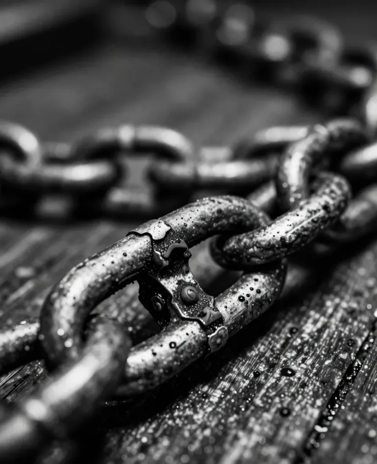 A close-up of a coiled steel chain resting on a weathered wooden surface, highlighted by soft, diffused lighting that accentuates the texture and depth of the chain and wood. The shallow depth of field blurs the background, emphasizing the chain's intricate details and the subtle interplay of light and shadow.