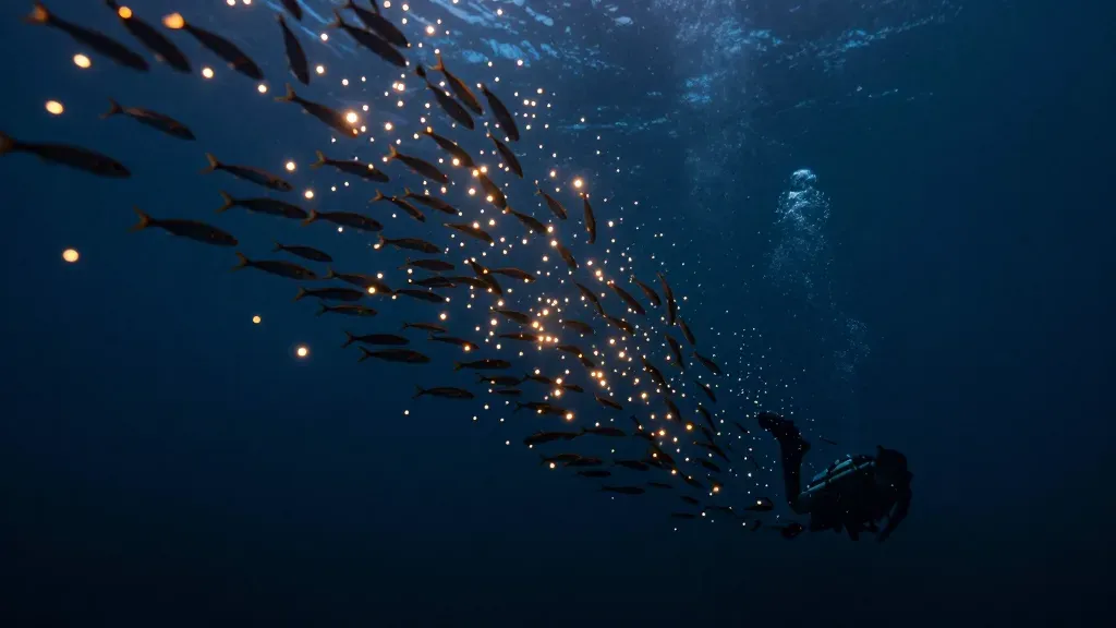 A school of lanternfish glows with a warm golden light, creating a mesmerizing cloud against the deep blue ocean. The diffused light from bubbles adds depth and movement to the composition, emphasizing the ethereal beauty of the underwater scene.