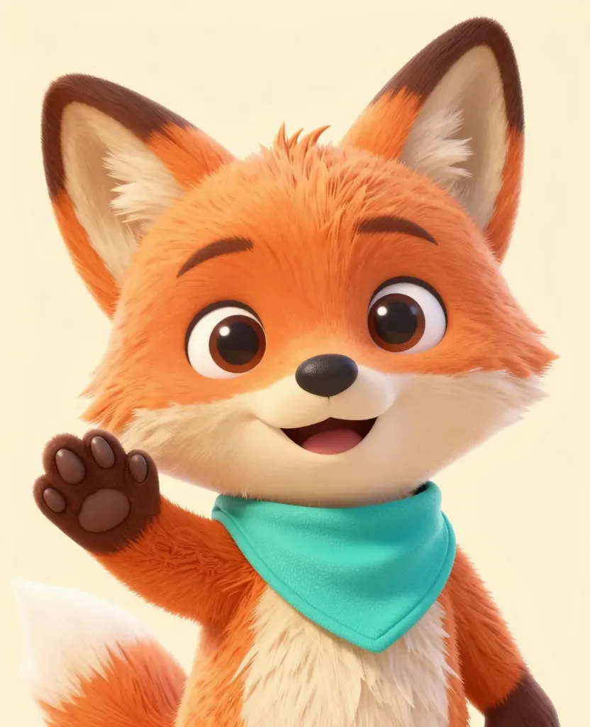 A close-up of a fluffy, curious fox pup waving with a glossy teal bandana, set against a soft, diffused light that highlights its fur texture and features. The neutral, light beige background provides a clean and unobtrusive backdrop, emphasizing the subject's playful and inviting expression.