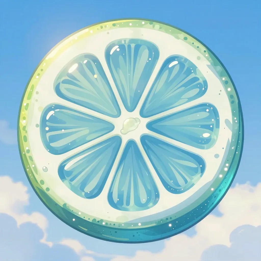 A close-up of a translucent glass lemon slice, glossy and slightly juicy, reflecting a soft, diffused light that highlights its texture against a blurred gradient of blue sky and white clouds. The composition is centered, emphasizing the vibrant cool blue tones and the subtle interplay of light and shadow.