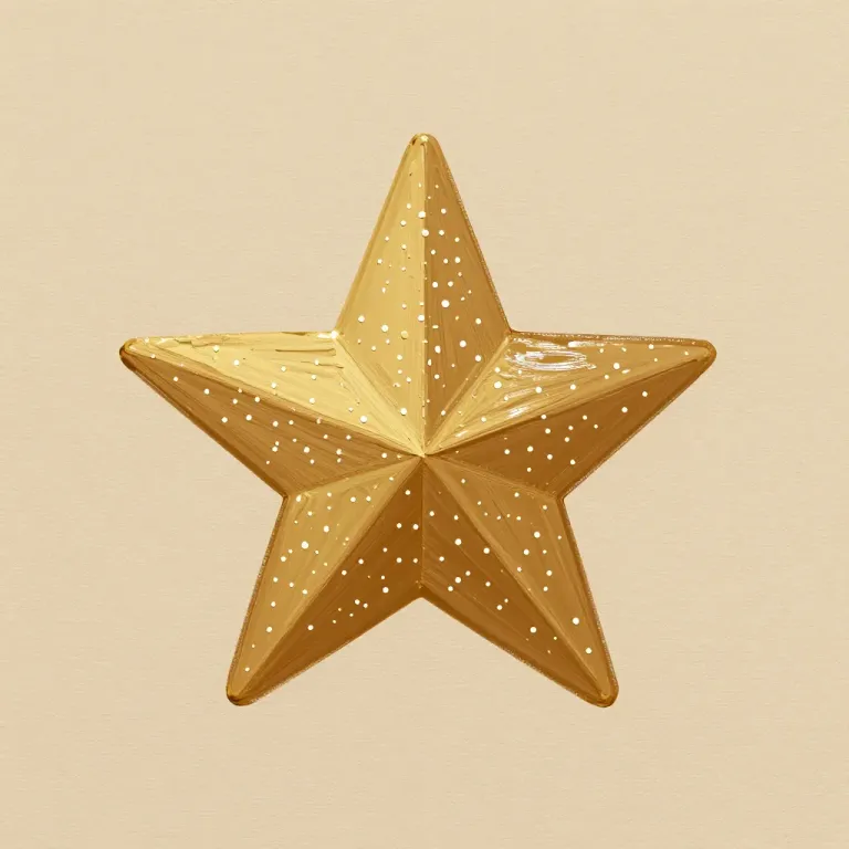 A glossy golden star with white speckles is centered against a soft, diffused light background, creating a reflective and elegant appearance. The symmetrical composition and neutral beige background provide a clean and versatile backdrop for various design applications.