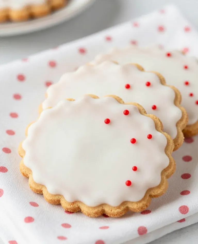 Three almond iced slices with scalloped edges are arranged diagonally, their smooth white icing topped with tiny red sprinkles and resting on a soft woven napkin with pink polka dots. Soft natural light from the upper left creates gentle highlights on the glossy icing and shallow depth of field isolates the cookies from the blurred background plate.