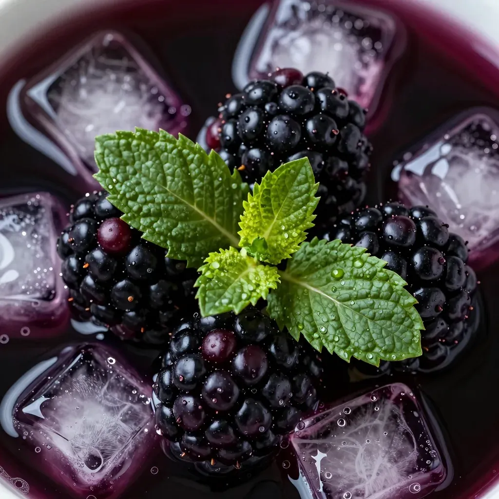A cluster of glossy blackberries with fresh mint leaves rests atop ice cubes in a viscous, deep purple liquid, showcasing juicy textures and crystalline ice. Soft overhead lighting creates gentle highlights and a shallow depth of field isolates the subject against a smooth, out-of-focus background.