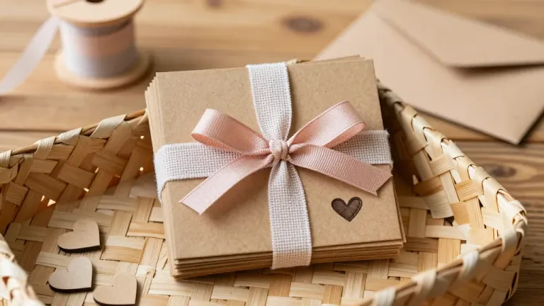 A stack of hand-stamped cards with soft pink ribbons and smooth wooden hearts, set against a blurred wooden background, creating a warm and inviting aesthetic. The soft, natural lighting highlights the textures and colors, making the image ideal for greeting card or wedding invitation designs.
