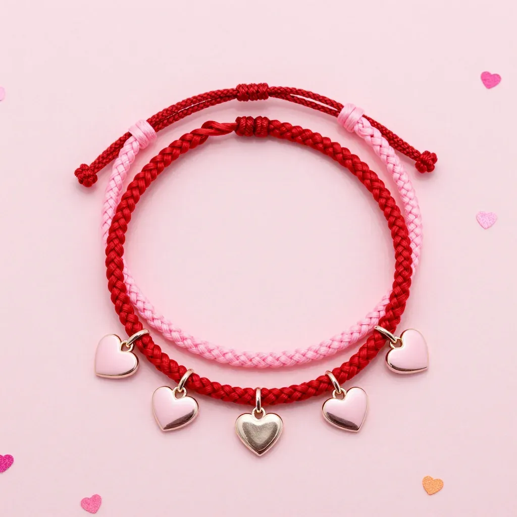 Two braided bracelets, one crimson red and one soft pink, are arranged in overlapping circles, each adorned with polished silver-tone heart charms that reflect soft, diffused light. The composition features a centered, shallow depth of field with a clean pale pink background scattered with faint heart motifs, providing ample copy space for design applications.