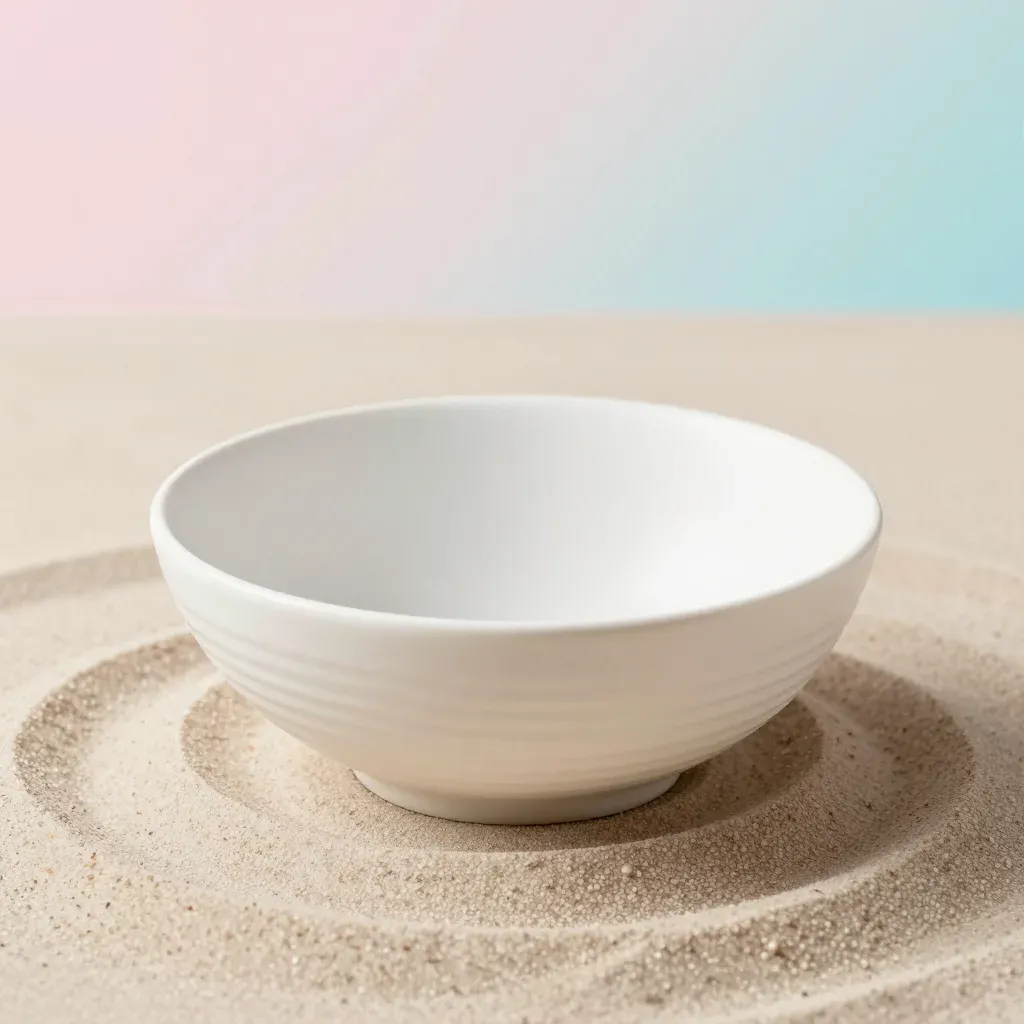 A smooth, glossy white ceramic bowl sits in a shallow indentation of light beige sand, illuminated by soft, diffused light that highlights the textures and creates a serene, minimalist composition. The pastel gradient background of pinks and blues enhances the tranquil and elegant aesthetic of the scene.