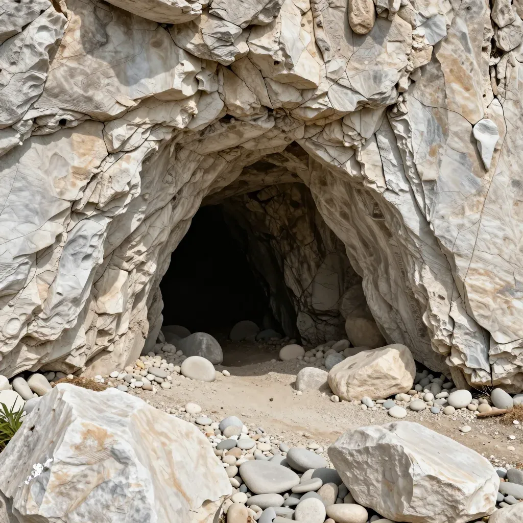 A natural entrance to a limestone cave, framed by rugged rock formations and smooth pebbles, bathed in diffused, soft light that highlights the textures and creates a sense of depth. The rocky terrain in the background is blurred, drawing focus to the entrance and creating a shallow depth of field.