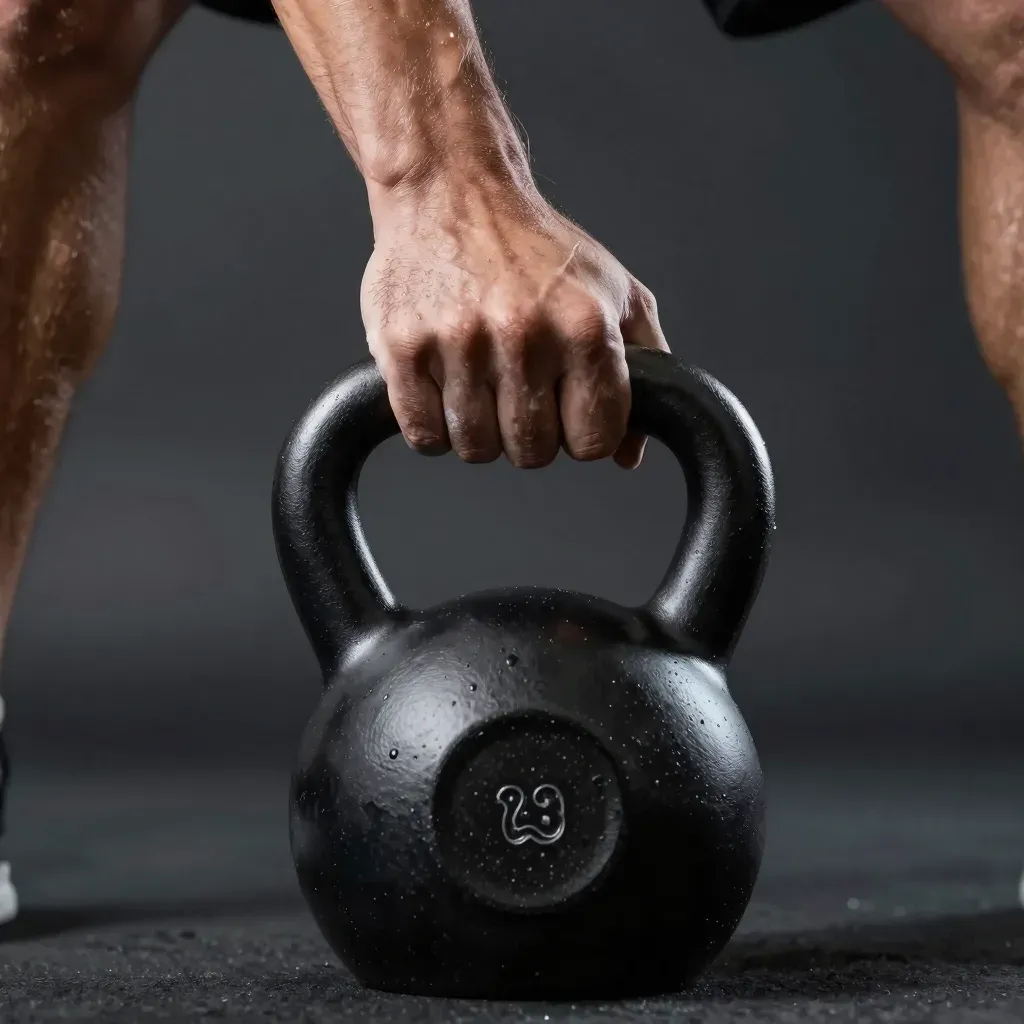 A close-up of a hand gripping a black kettlebell with a rough handle, highlighted by focused, directional lighting that creates a dramatic effect. The dark, blurred background provides a stark contrast to the subject, emphasizing the texture and movement of the hand and kettlebell.