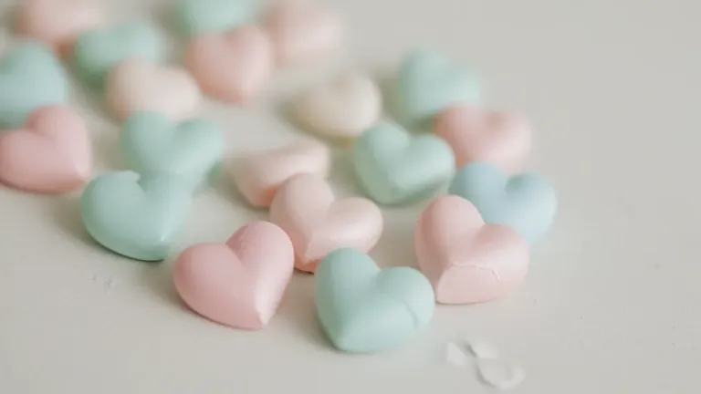 A close-up of pastel heart-shaped candies with a soft, glossy texture, arranged on a light beige surface. The diffused lighting highlights the candies, creating a gentle glow and shallow depth of field that draws attention to the subject.