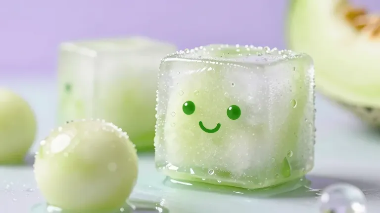 A close-up of a translucent honeydew ice block with cute green eyes and a smile, highlighted by soft, diffused light. The shallow depth of field and soft lavender background emphasize the ice block's texture and droplets, creating a playful and refreshing visual.