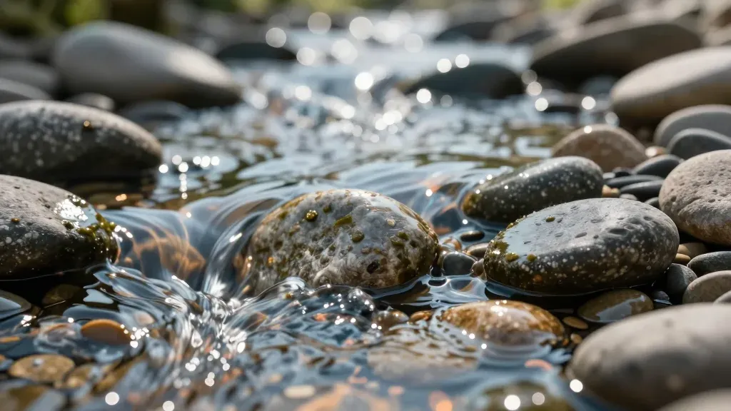 Smooth, rounded stones with specks of moss reflect soft, diffused sunlight, creating a warm glow on the clear blue water. The shallow depth of field blurs the background, focusing attention on the foreground interaction between the water and stones.