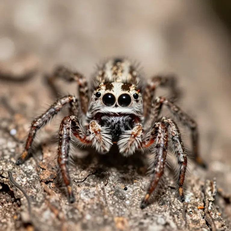 A close-up of a jumping spider with prominent eight eyes, showcasing its velvety, hairy texture and earthy tones. The soft, diffused lighting highlights the spider's intricate details against a blurred, natural background.