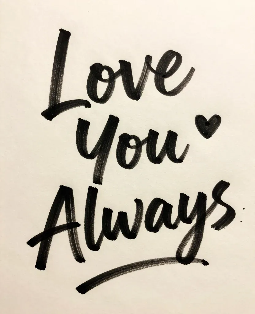 A heartfelt message of affection rendered in smooth black ink, set against a stark white background, highlighting the texture of the paper and the soft, even lighting that enhances the emotional depth of the text.