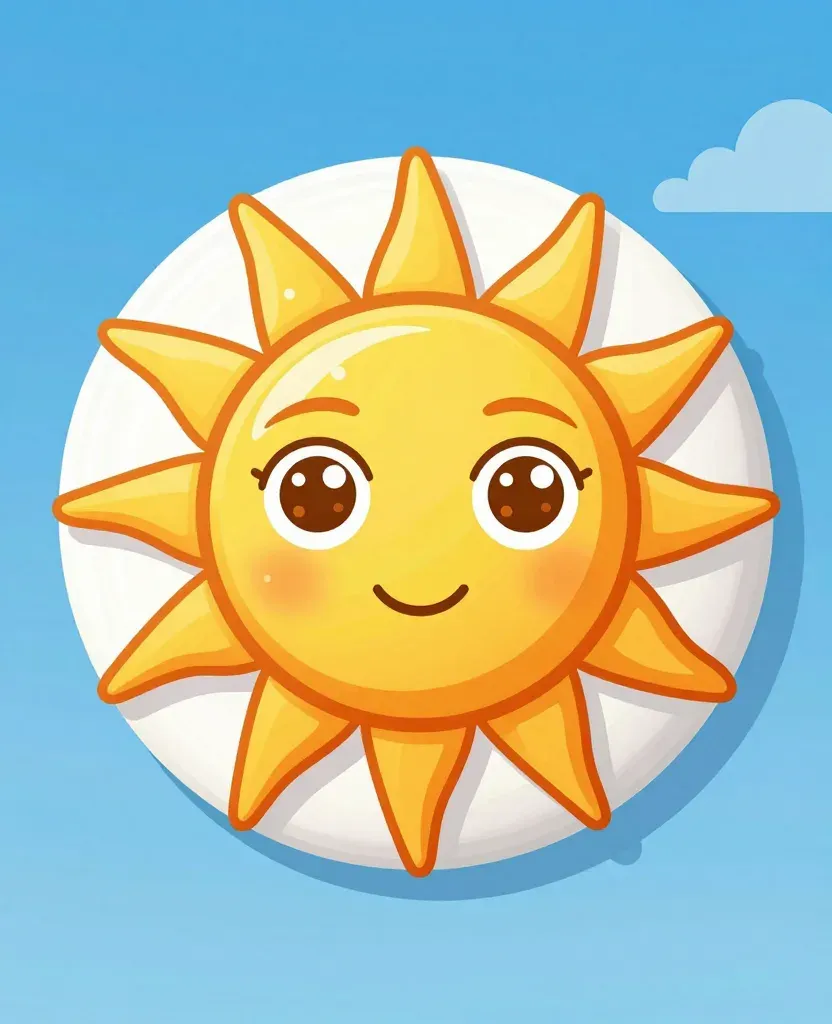 A cheerful cartoon sun with a smiling face and bright yellow-orange color, set against a clear blue sky with fluffy white clouds. The even lighting highlights the sun's features and creates a soft glow, making the image vibrant and inviting.