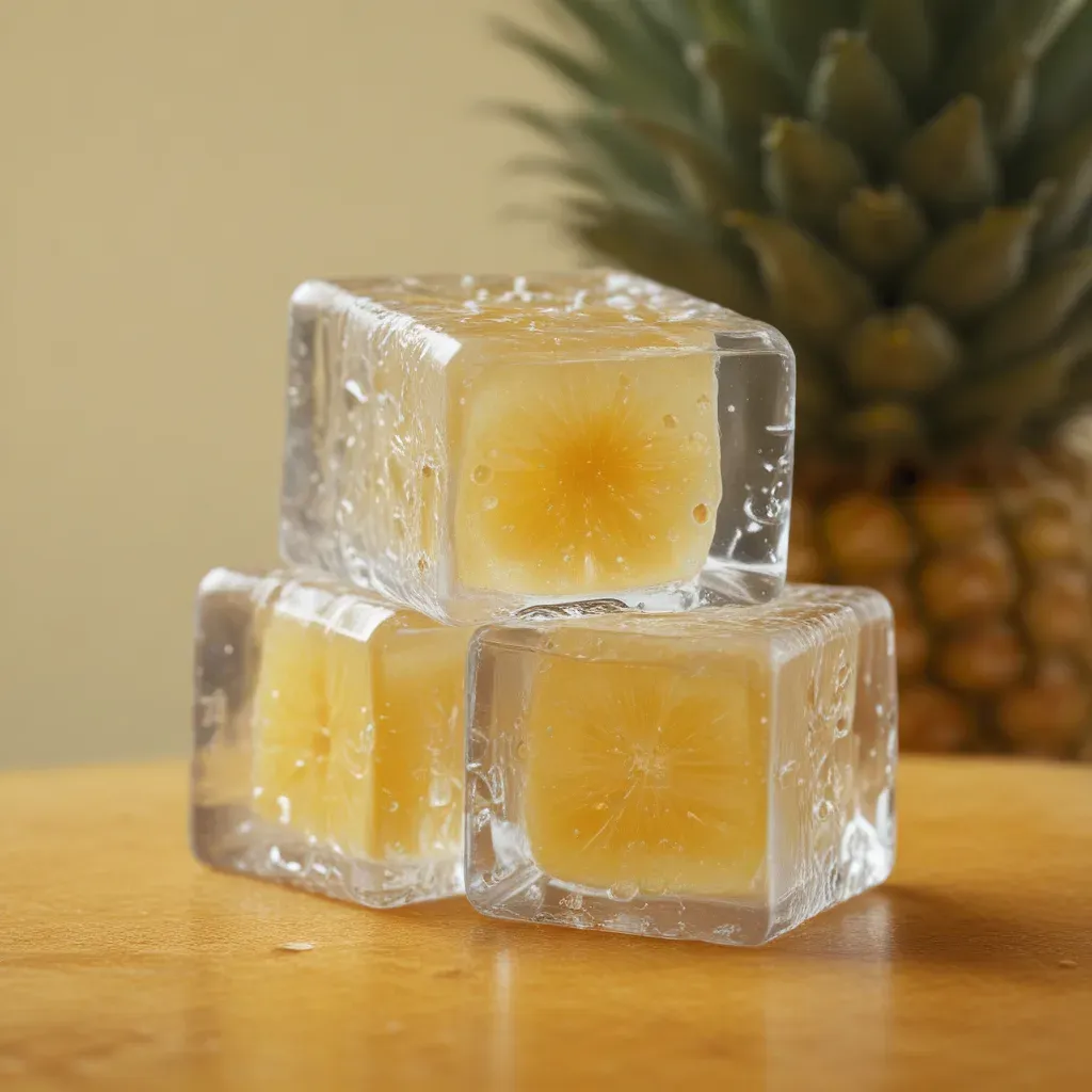 Stacked pineapple-infused ice cubes with a soft, juicy interior, illuminated by diffused light, creating a visually appealing contrast against a blurred pineapple and warm background. The composition offers a clean and shallow depth of field, ideal for product photography and culinary themes.