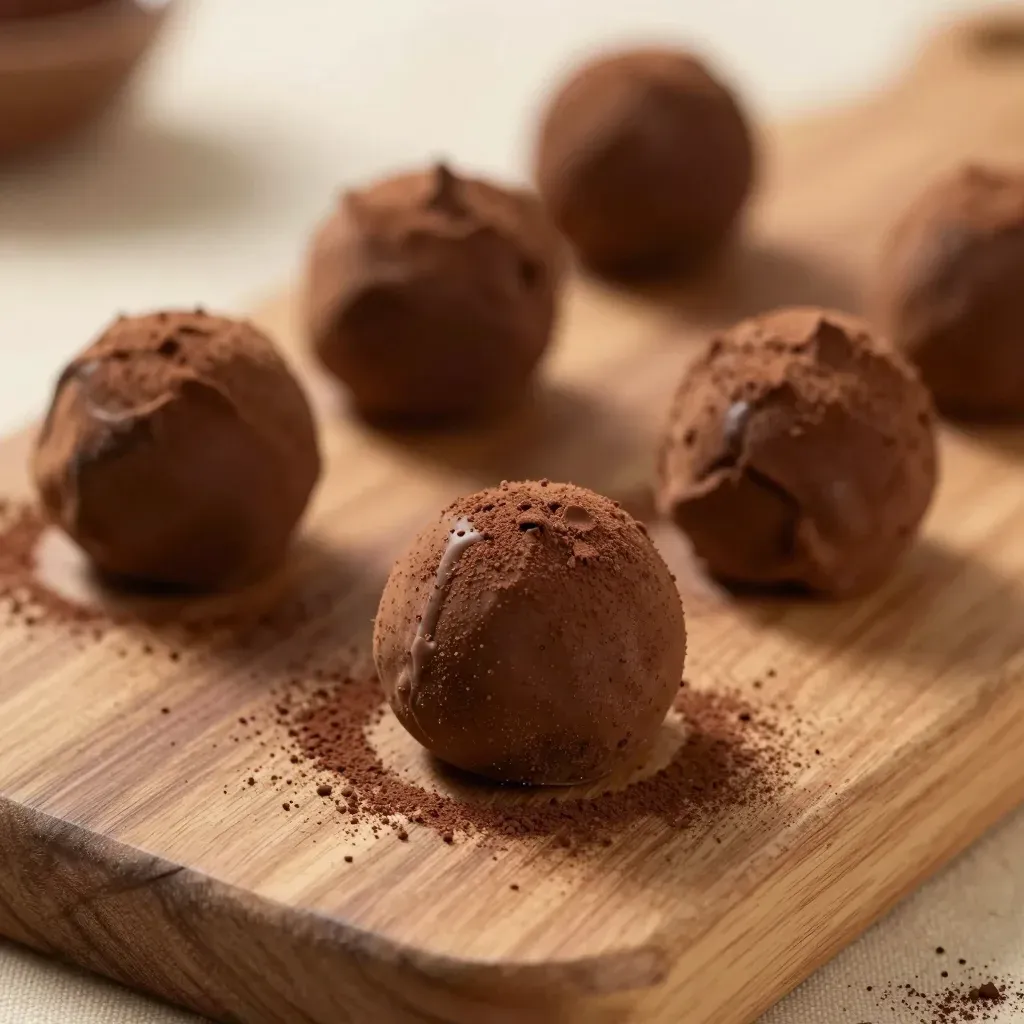 Smooth, glossy chocolate truffles coated with fine cocoa powder are arranged in a linear row on a wooden cutting board, illuminated by soft, warm directional light that highlights their glossy surface and casts gentle shadows, creating a sense of order and focus against a blurred neutral beige background.