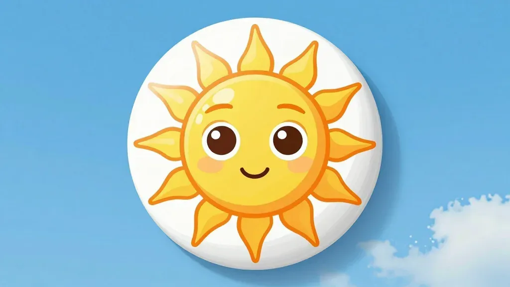 A cheerful sun with anthropomorphic features and golden rays peeks out from behind a fluffy white cloud, creating a warm and inviting atmosphere. The soft, diffused light enhances the serene and minimalistic composition against a clear blue sky.