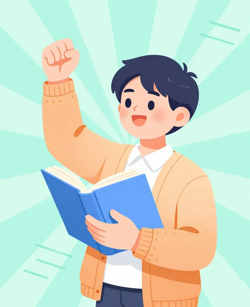 A young male student in a mustard cardigan raises his fist in triumph while holding an open blue notebook, his expression joyful and energetic. The image features bright, diffused overhead lighting with radial highlights creating a halo effect, and a shallow depth of field on the abstract mint green sunburst background.