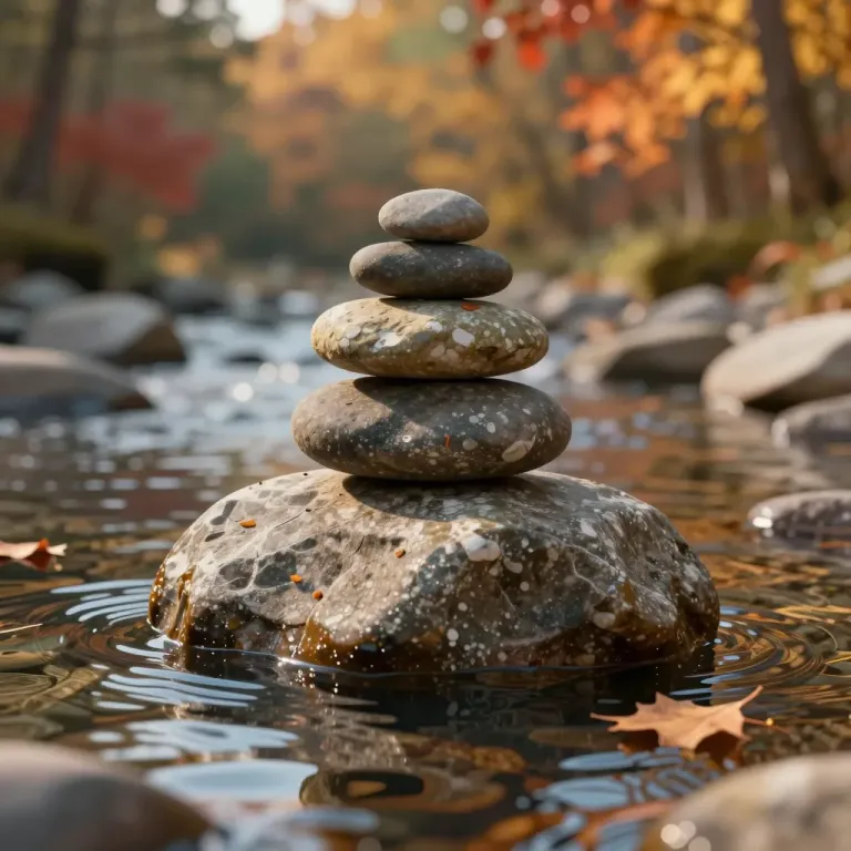 A stack of smooth, rounded stones balanced on a textured rock, surrounded by clear water and golden sunlight, creating a serene autumnal scene with shallow depth of field blurring the background foliage.