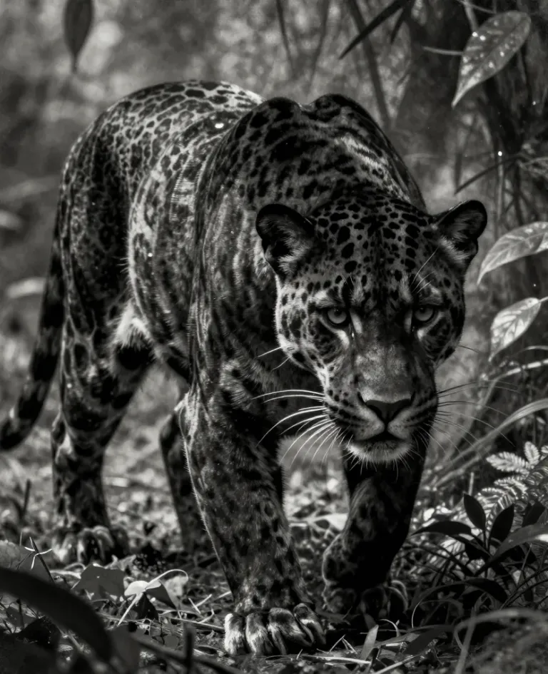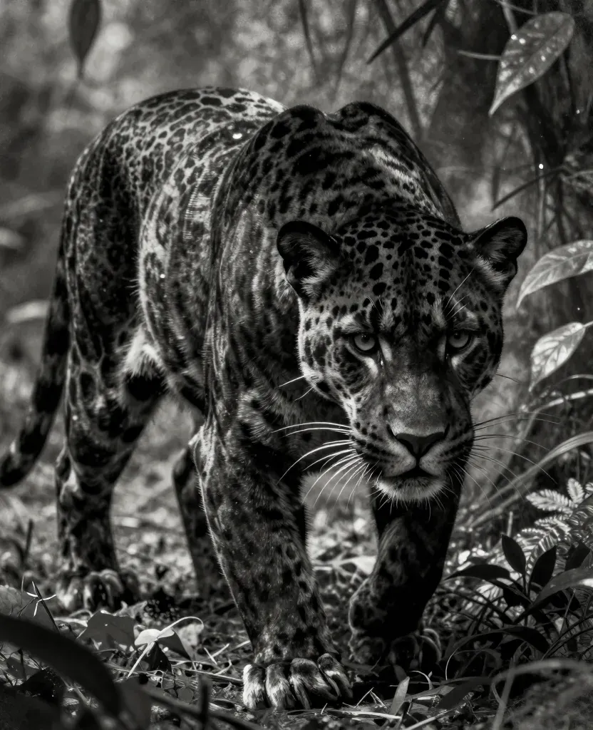 A crouched jaguar, its glossy spots and coarse fur detailed in monochromatic tones, is alert and focused amidst dense jungle foliage. The diffused, soft light filtering through the trees creates a moody atmosphere, with the background blurred to emphasize the jaguar's presence.