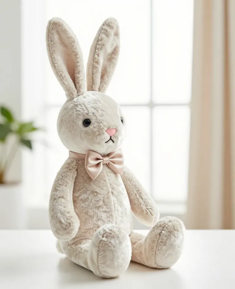 A plush velvet bunny with a delicate blush bow sits by a window, bathed in soft, diffused sunlight. The composition is centered, allowing ample copy space for text or design elements.