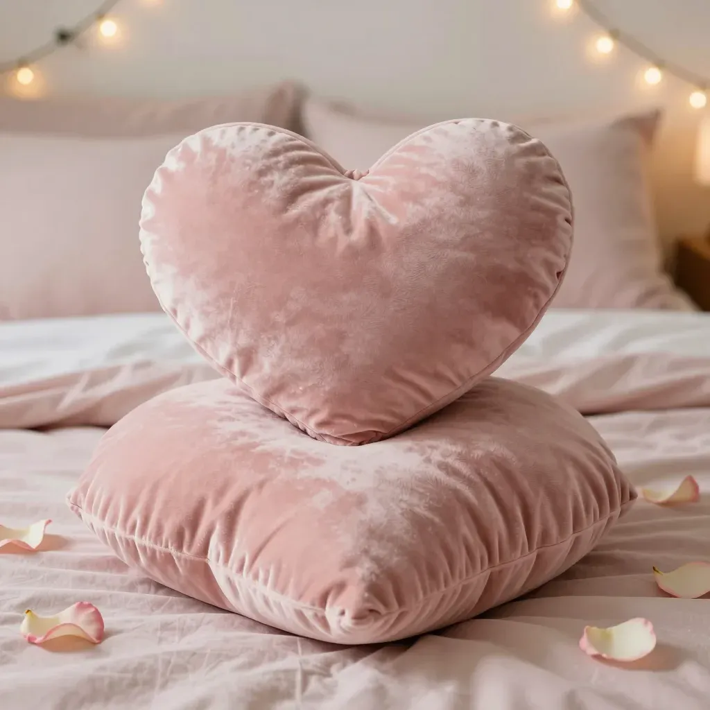 Soft, plush heart-shaped and round velvet pillows rest on a bed with white linens and scattered rose petals, illuminated by warm, ambient string lights. The shallow depth of field draws attention to the pillows, creating a cozy and romantic atmosphere.