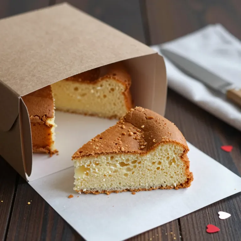 A slice of golden sponge cake with sesame seeds is presented in a box, showcasing its airy texture and light crumbly interior. The warm, ambient lighting highlights the cake's texture and creates a soft, inviting glow, while the dark wooden table and scattered red heart confetti add a whimsical touch.