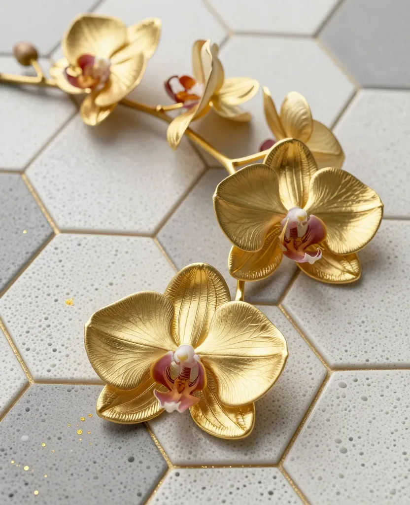 A gilded orchid sprig with soft, velvety petals and delicate pink and white centers is arranged diagonally across hexagonal tiles, highlighting the texture and sheen of the gold and the intricate details of the flowers. The soft, diffused lighting enhances the elegance of the composition, creating a sense of depth and leading the eye through the image.
