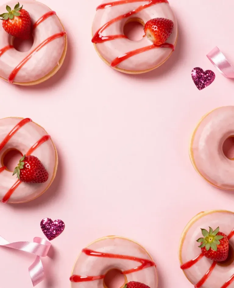 Smooth glaze and vibrant red drizzle adorn these donuts, set against a soft pink backdrop that enhances their glossy texture and bright colors. The symmetrical arrangement creates a frame-like effect, ideal for culinary or food-themed designs.