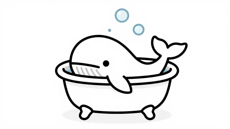 A minimalist whale rests in a clawfoot bathtub with pale blue bubbles rising above, rendered in smooth, rounded lines. The image features even, diffused lighting and a plain light gray background, creating a clean, uncluttered composition with ample copy space.