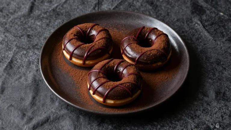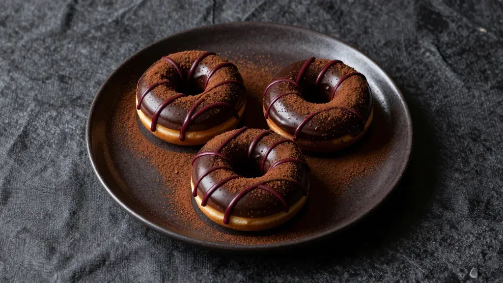 Glossy chocolate-glazed donuts with dark chocolate drizzle and cocoa powder, softly lit from above, creating a warm ambiance and highlighting the rich textures. The shallow depth of field blurs the dark, textured background, making the donuts stand out sharply.