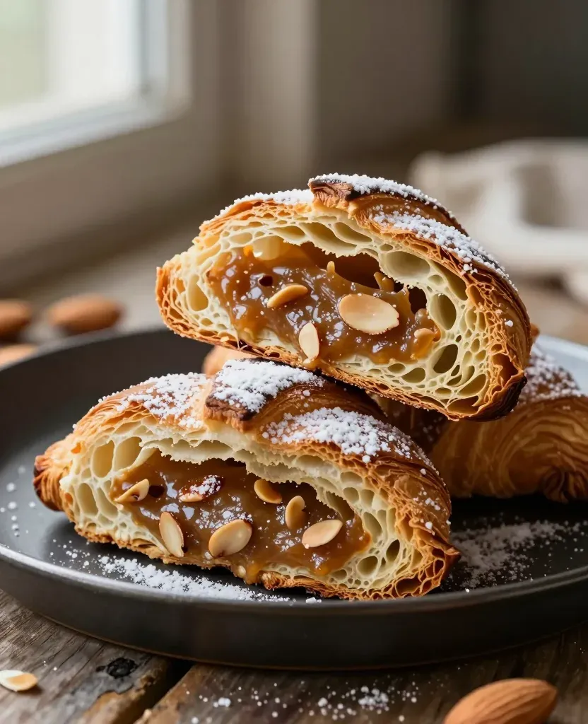 Golden-brown croissant halves filled with glossy caramel and crunchy almonds, dusted with powdered sugar, softly lit by a nearby window, creating a warm, inviting atmosphere. The blurred background of additional croissants and almonds suggests a cozy bakery setting.