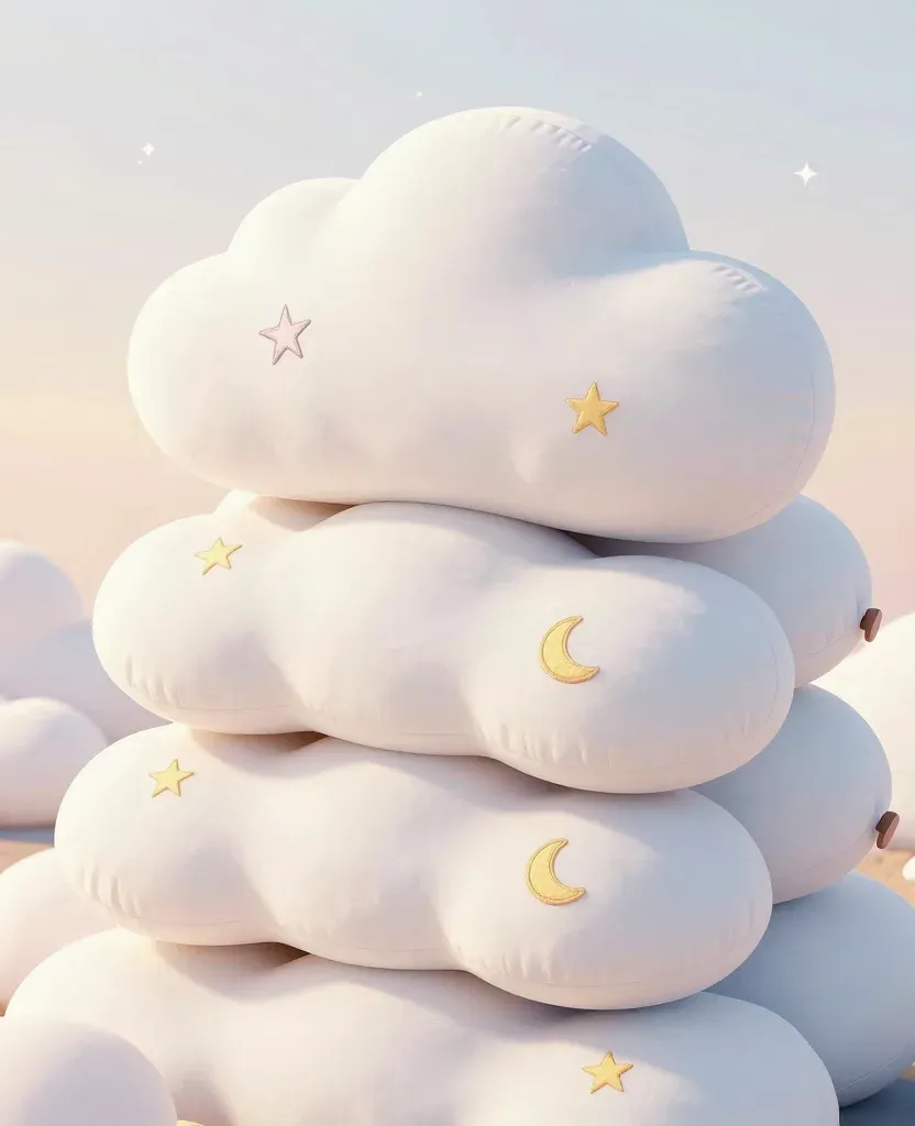 A serene stack of cloud pillows adorned with golden crescent moons and stars, illuminated by soft, diffused light that highlights their fluffy texture and glossy accents. The background features a pastel sky with more cloud pillows, creating a calming and dreamy atmosphere.