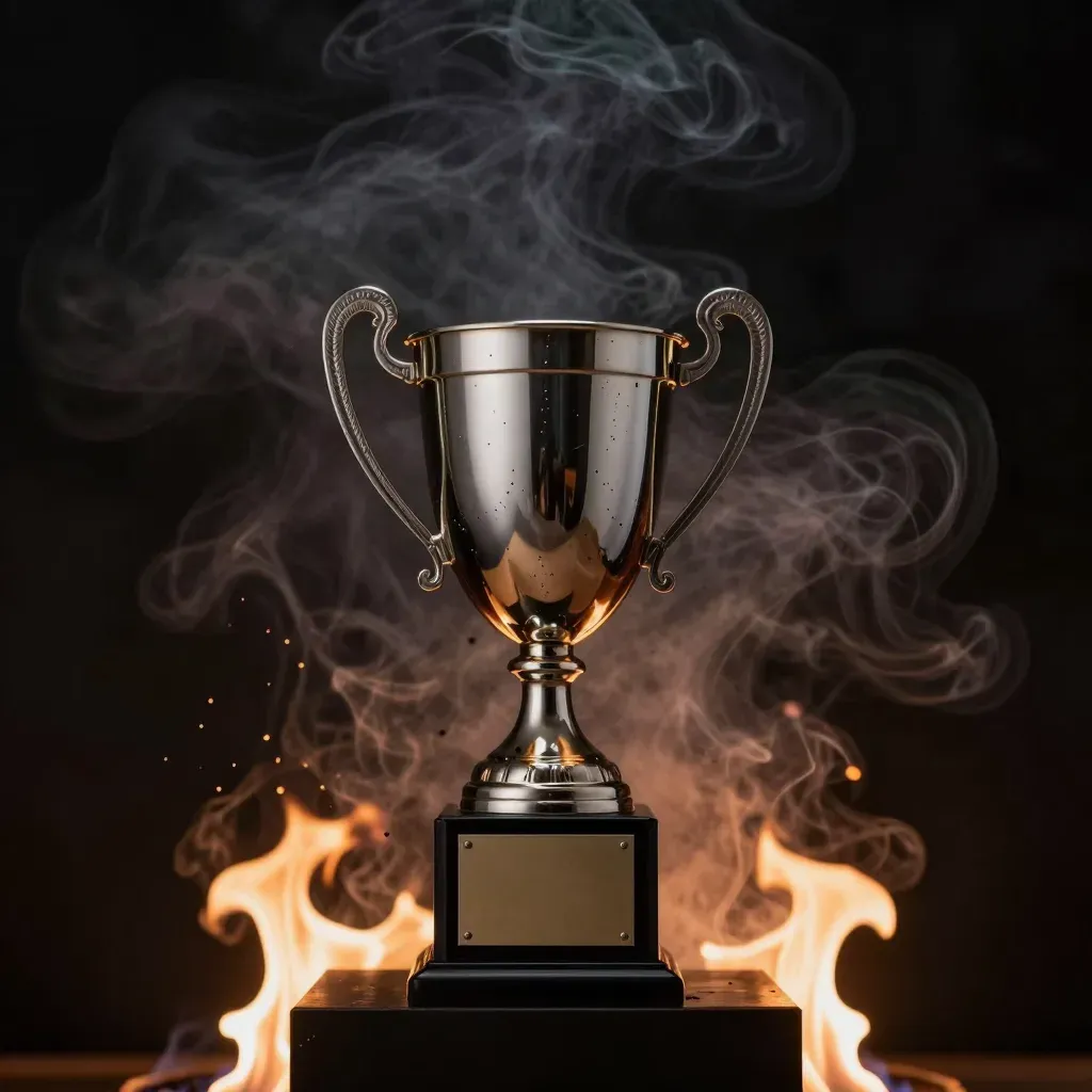 A polished silver trophy cup with curved handles is surrounded by swirling flames and smoke, creating a dramatic interplay of light and shadow. The dark, blurred background emphasizes the trophy and flames as the focal points, with warm orange lighting casting a glowing effect.