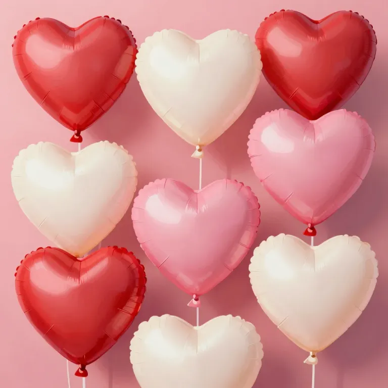 Glossy, smooth, reflective heart-shaped balloons in various shades of red, white, and pink are arranged in a scattered pattern against a soft pink backdrop, creating a romantic and celebratory mood. The diffused, soft light enhances the reflective quality of the balloons, adding depth and dimension to the composition.