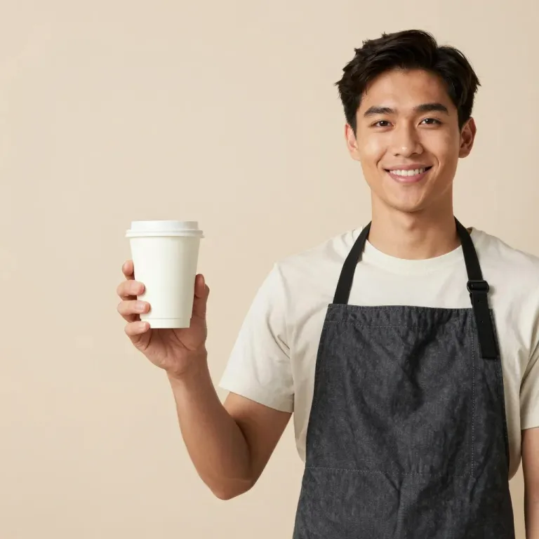 A young male barista smiles warmly while holding a white disposable coffee cup forward, wearing a dark textured apron over a white T-shirt. Soft diffused lighting from the upper left highlights the cup rim and facial features, with a shallow depth of field isolating the subject against a seamless beige backdrop.