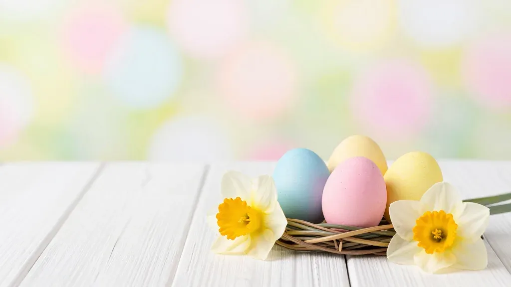 Smooth pastel-colored eggs and delicate daffodils nestled in a rustic woven straw nest on a white wooden table, bathed in soft, diffused light that highlights the textures and creates a dreamy, airy effect in the blurred pastel background.