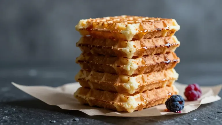 A stack of golden waffles with creamy filling and glossy syrup, softly lit to highlight the textures and colors, creating a balanced and appetizing composition against a dark, neutral background.