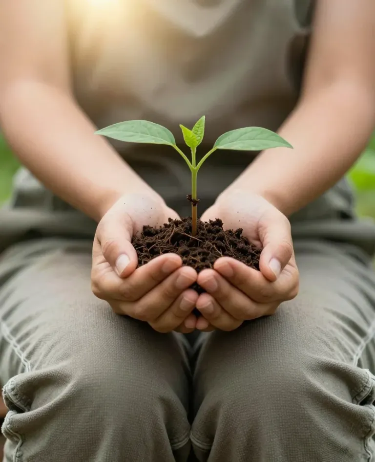 Gentle hands cradle a young plant with rich, moist soil, its glossy green leaves glowing under soft morning light. The shallow depth of field and blurred background create a serene, focused composition, ideal for themes of growth and nurturing.