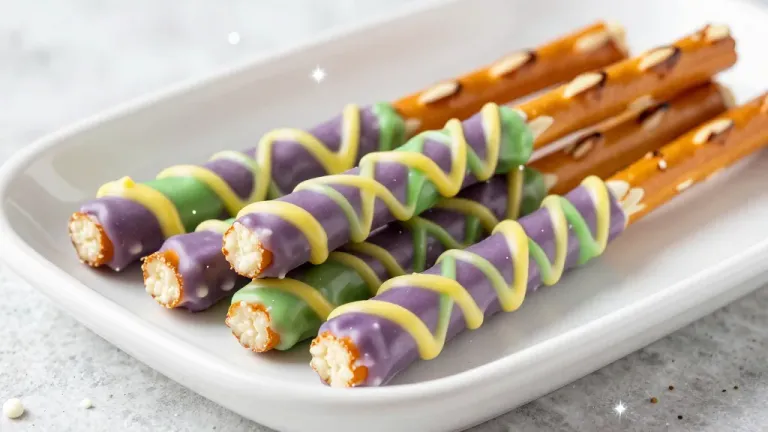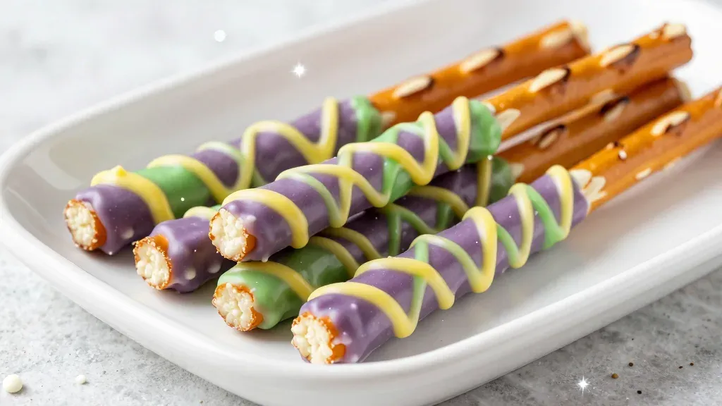Close-up of pretzel rods coated in smooth chocolate with glossy drizzles, softly lit to highlight textures and create subtle shadows. Minimalistic background with a blurred white plate and light gray countertop provides clean copy space.