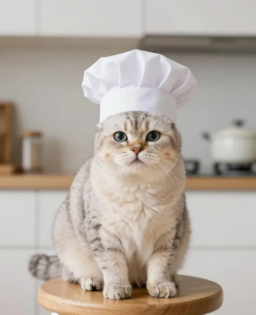 A fluffy cat with blue eyes and soft, fluffy fur is wearing a crisp white chef's hat, sitting on a wooden stool in a cozy kitchen with white tiles and wooden shelves. The soft, diffused lighting highlights the cat's fur and the chef's hat, creating a warm and inviting atmosphere.