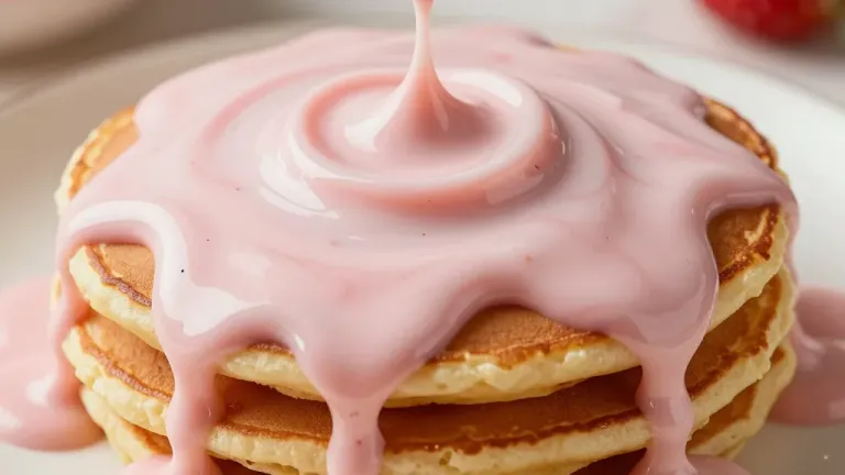 A stack of golden pancakes is topped with a glossy swirl of pink cream, illuminated by warm, soft light that highlights the textures and reflections. The shallow depth of field keeps the focus on the creamy swirl, while the blurred background hints at fresh strawberries, enhancing the fruity theme.