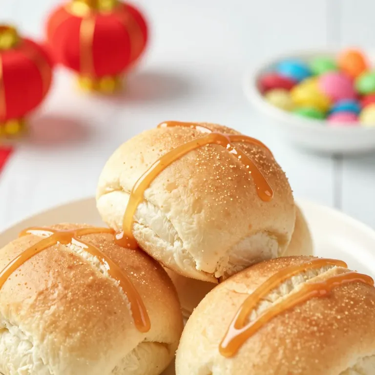 Golden-brown buns with a glossy caramel drizzle, softly lit to highlight their texture and color, set against a blurred festive background with red lanterns and colorful eggs, creating a shallow depth of field that draws attention to the buns.