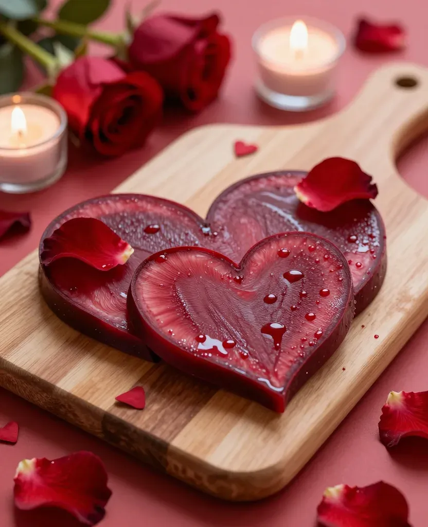 Glossy, deep crimson beetroot hearts rest on a natural wood cutting board, surrounded by scattered rose petals and soft candlelight, evoking a romantic and intimate atmosphere. The shallow depth of field emphasizes the central subject while the warm, directional lighting enhances the moist texture and rich color contrast against the terracotta background.